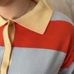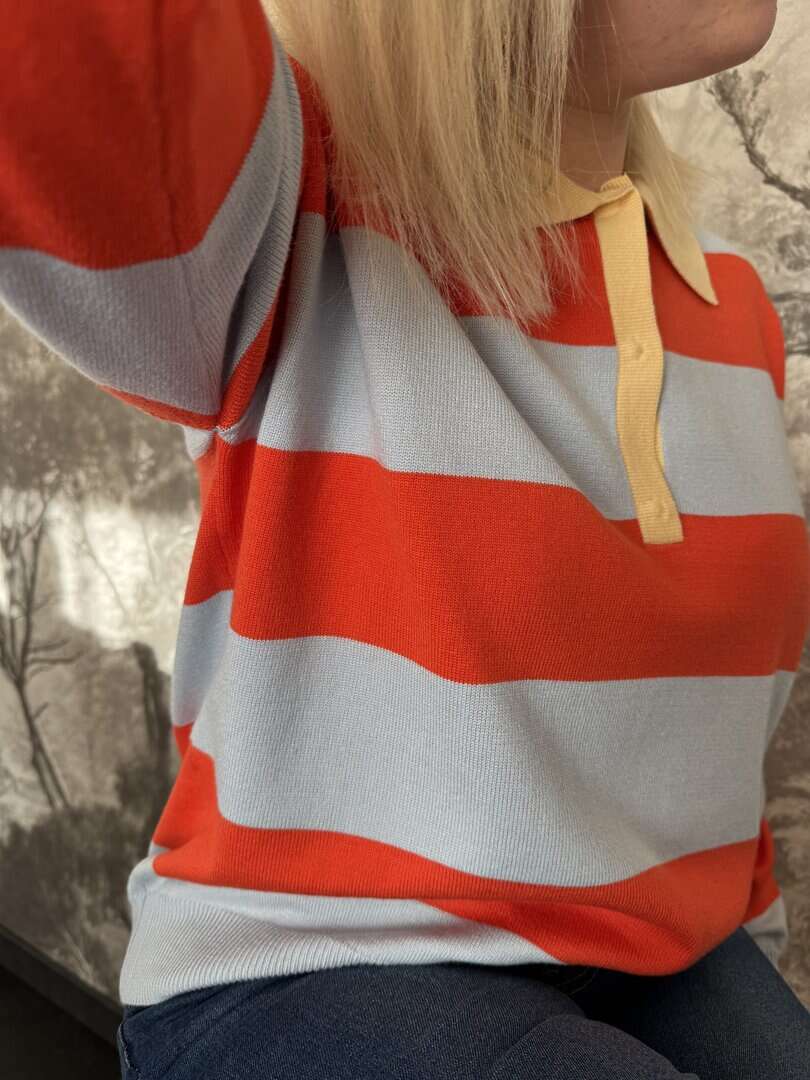 Affirmez votre style avec ce pull polo en maille fine, parfait mélange entre confort rétro et modernité. Ses rayures contrastées bleu ciel et orange mandarine, rehaussées par un col jaune pâle, en font la pièce maîtresse de vos looks de saison.